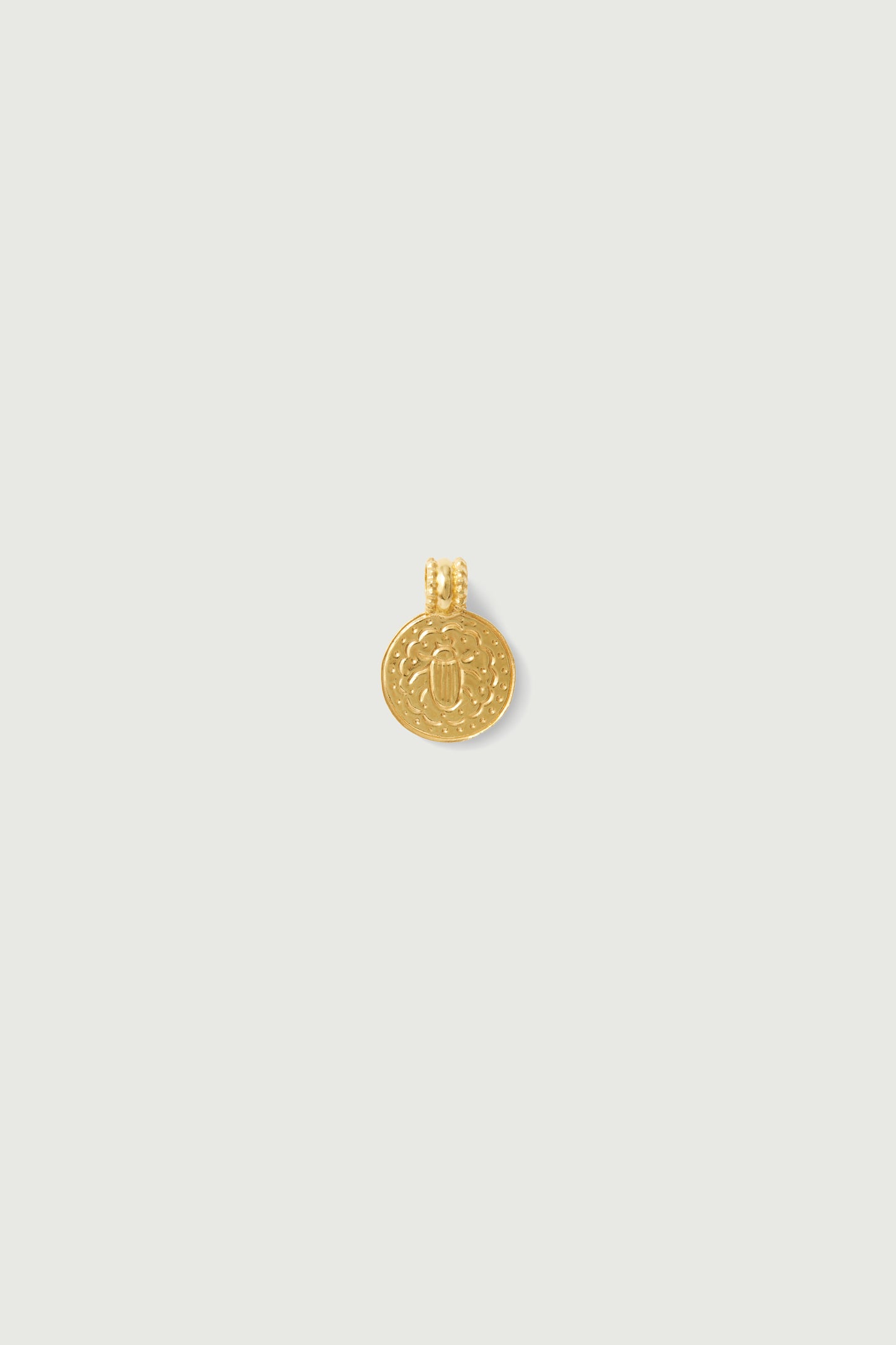 DOMITILLE1 est un pendentif rond en vermeil décoré d'un scarabée. Les motifs à l'intérieur de la médaille sont gravés par martelage.
