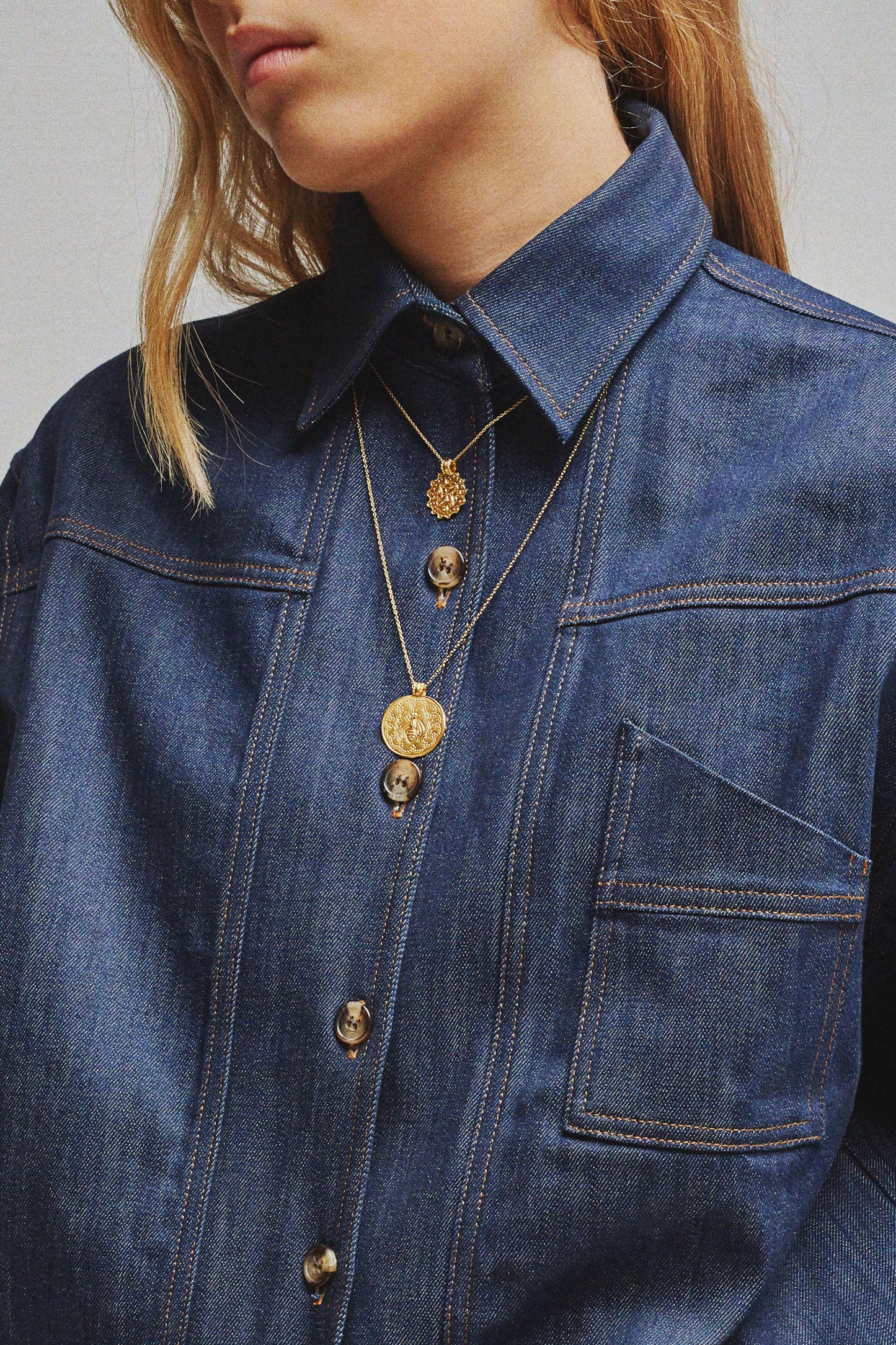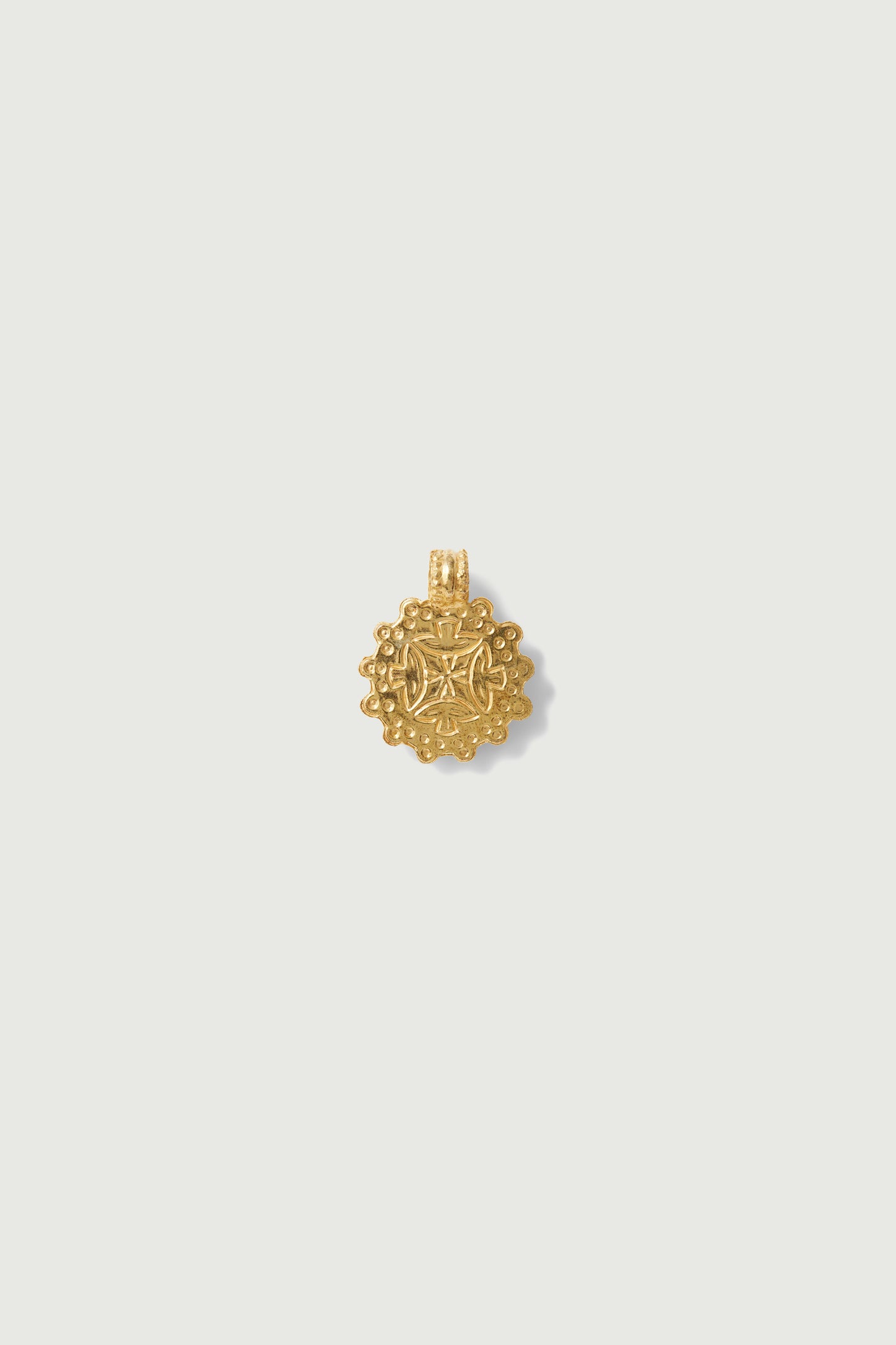 DOMITILLE 2 est un pendentif rond en vermeil décoré d'une hirondelle. Les motifs à l'intérieur de la médaille sont gravés par martelage.