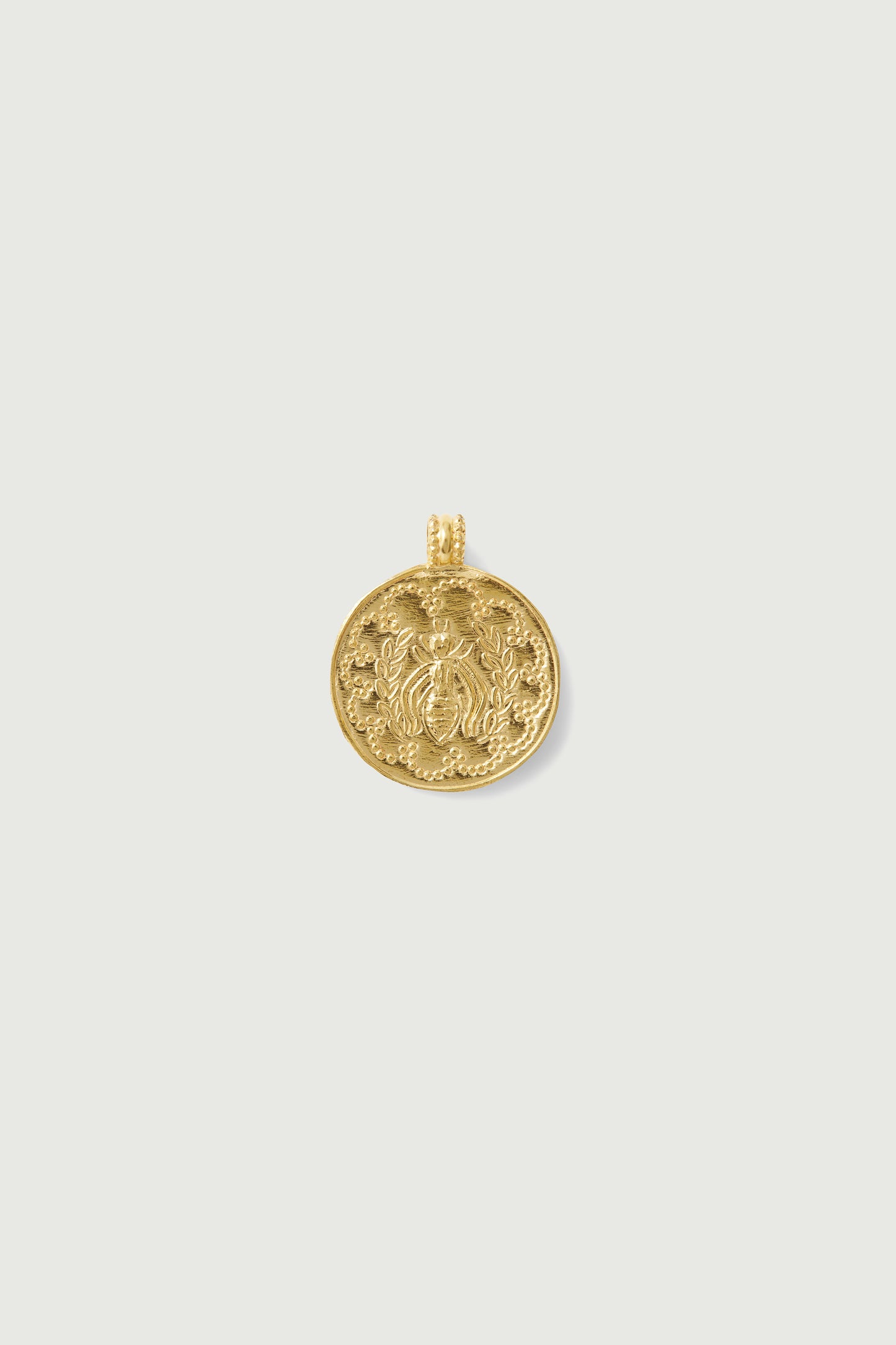 DOMITILLE 3 est un pendentif rond en vermeil décoré d'une abeille. Les motifs à l'intérieur de la médaille sont gravés par martelage.