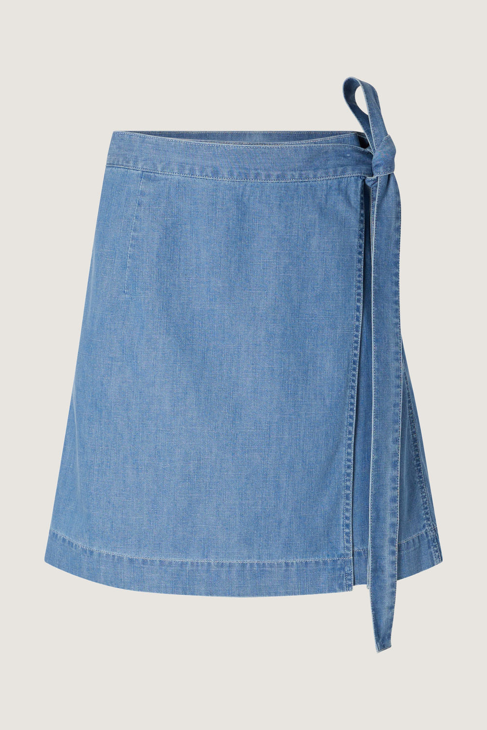 AIME est une jupe portefeuille asymétrique qui reprend les codes des tabliers à nouer sur le côté. Elle est tissée en chambray, une toile plus légère que le denim adaptée à l'été. Des surpiqûres contrastées apportent du relief au vêtement.