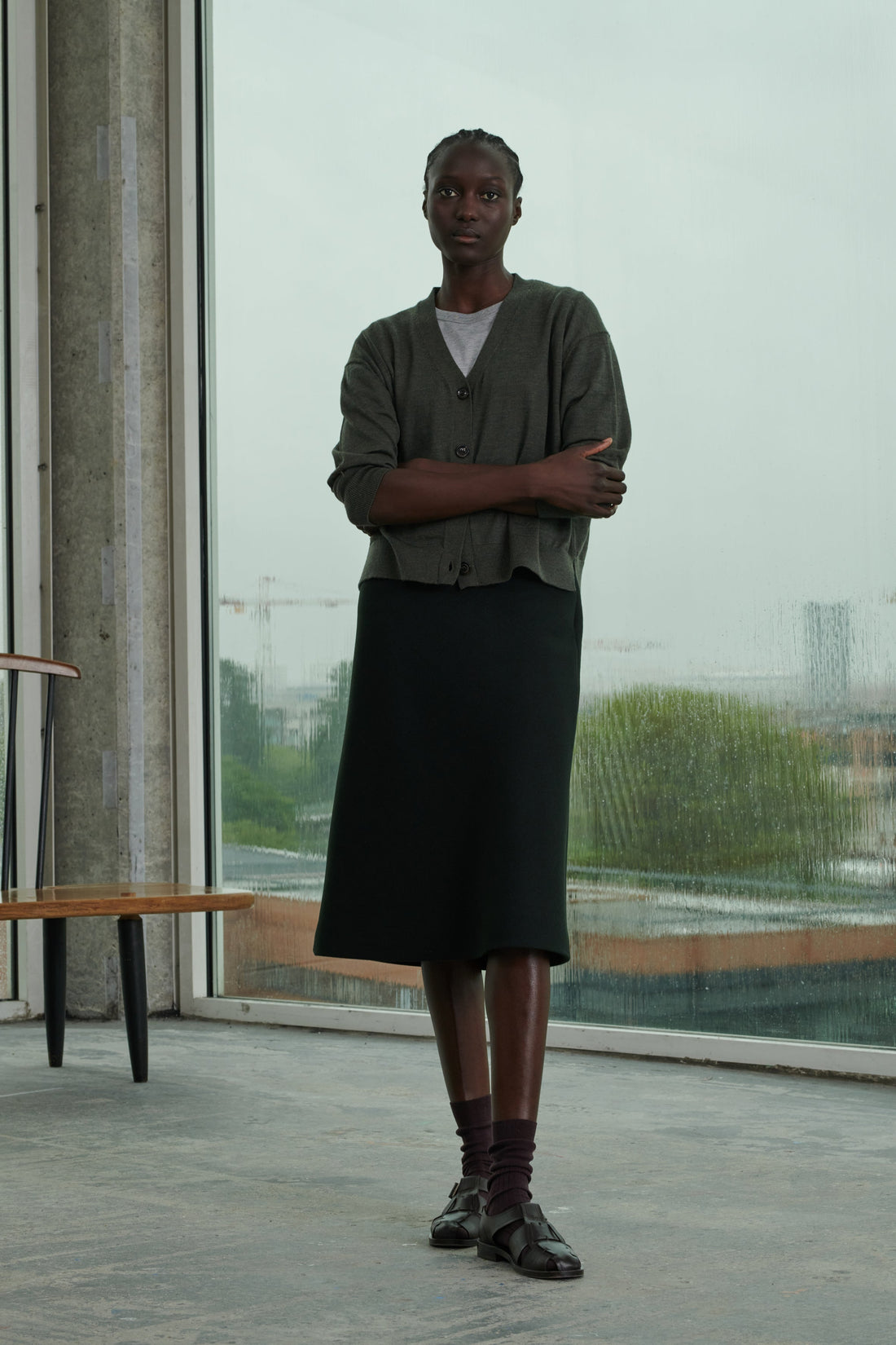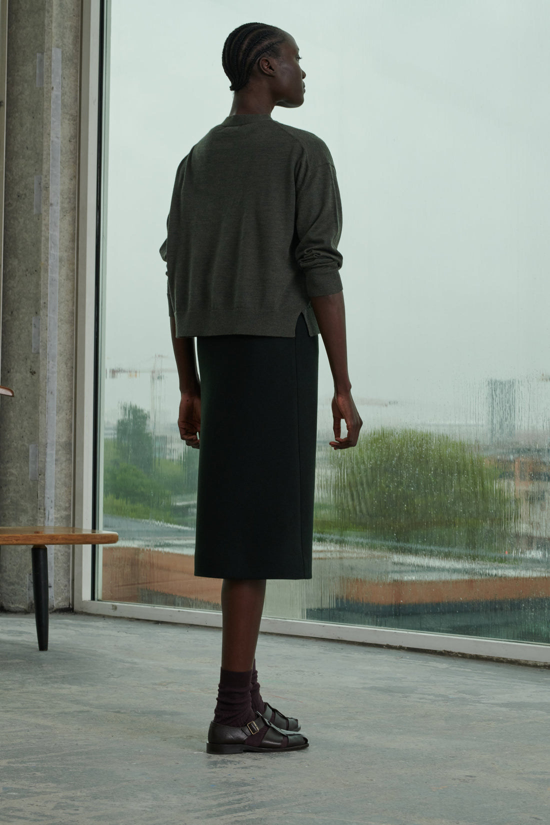 VALET est une jupe midi à la coupe droite. Elle est réalisée dans un lainage épais et luxueux, à la texture "grain de poudre" qui reposera confortablement sur la taille. C'est une pièce sophistiquée et luxueuse de par son savoir-faire et son tissu d'exception.