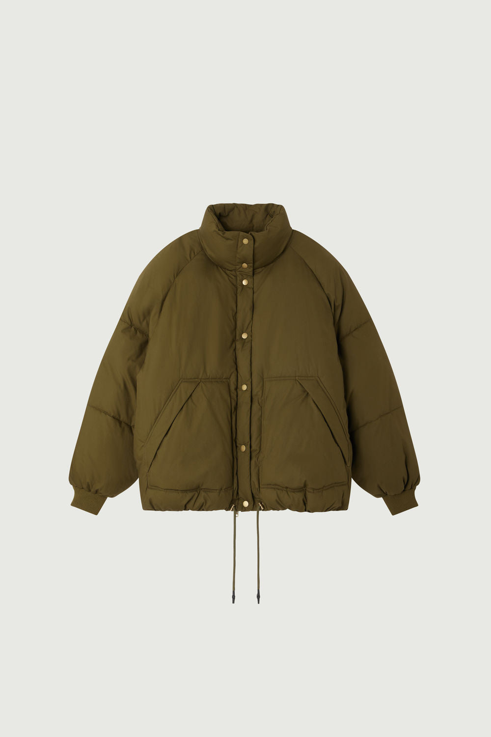 WING est une doudoune courte en popeline déperlante dans une teinte de kaki. Elle offre des manches longues raglan et une ouverture à patte de boutonnage et à zip caché. Les poches raglan surpiquées, avec fonds en polaire, ajoutent chaleur et fonctionnalité, tandis que le bas de corps est ajustable avec un cordon pour un maintien parfait.