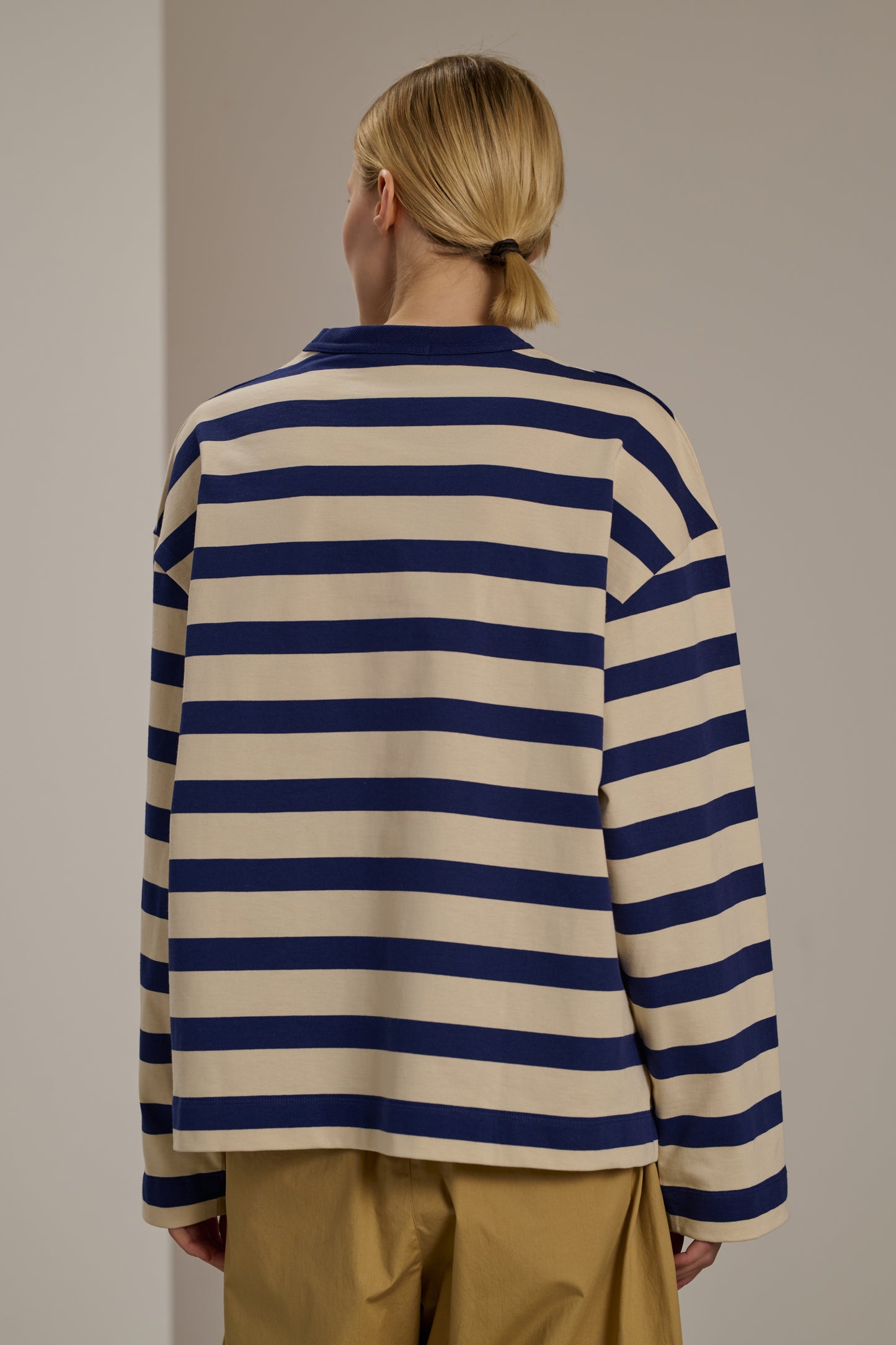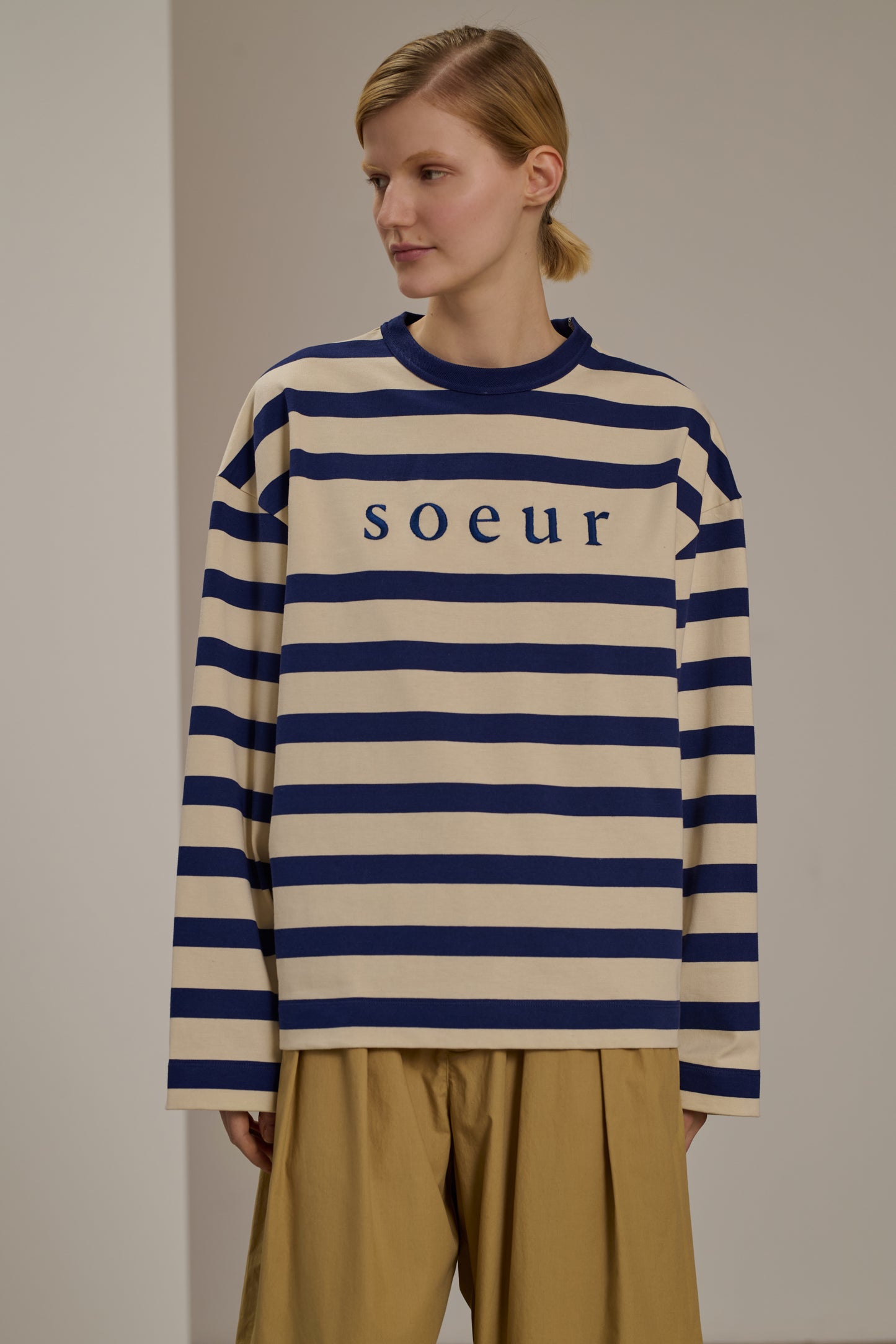 ARCHIE est notre nouvelle marinière. Cette version à larges bandes écrues et bleues est proposée dans un jersey de coton biologique. Sa coupe résolument oversize se porte en t-shirt large à même la peau ou en superposition comme un sweatshirt fin. Le logo "Soeur "est brodé sur l'avant.